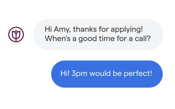 Send and receive text messages with candidates directly. Automate welcome messages and enable self-scheduling interviews.